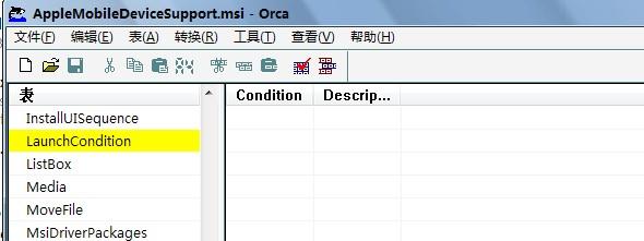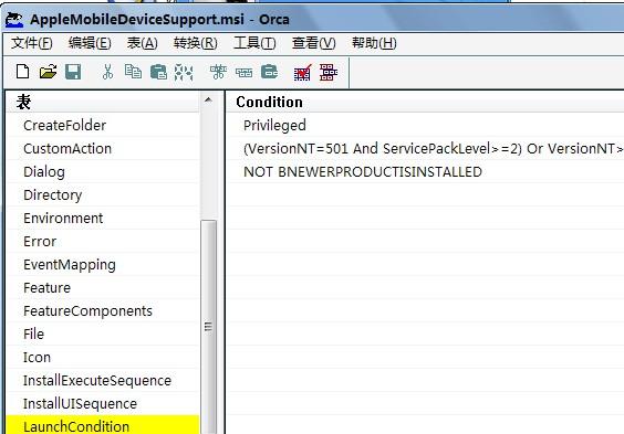 用Orca工具打开AppleMobileDeviceSupport.msi,在左侧找到LaunchCondition如下图