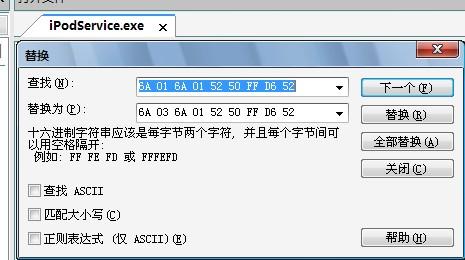 直接用winrar 打开iTunes.cab,解压出iPodService.exe文件。用UltraEdit打开iPodService.exe,打开菜单—搜索—替换。将6A 01 6A 02 6A 00 6A 00 C7替换为6A 03 6A 02 6A 00 6A 00 C7,在将6A 01 6A 01 52 50 FF D6 52替换为6A 03 6A 01 52 50 FF D6 52。因为这里在比较版本号的时候用了相等比较,改了之后版本的比较就是大于等于比较了,这样Windows 2003也能比较通过了。修改完之后保存。