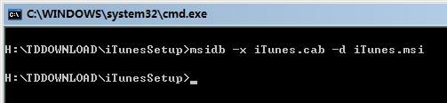 然后输入msidb -x iTunes.cab -d iTunes.msi将iTunes.msi中的iTunes.cab包提取出来