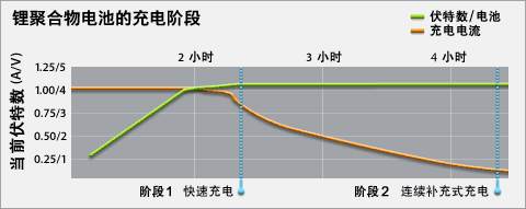 图中横轴是时间轴,纵轴是A/V(安/伏特)。图中分为两个阶段,第一阶段就是快速充电,第二阶段是连续补充式充电(即完全充电)。第一阶段充电在80%,另外20%在第二阶段完成。这里要注意的是充电电流和电压其实都是呈不规则曲线分布的。