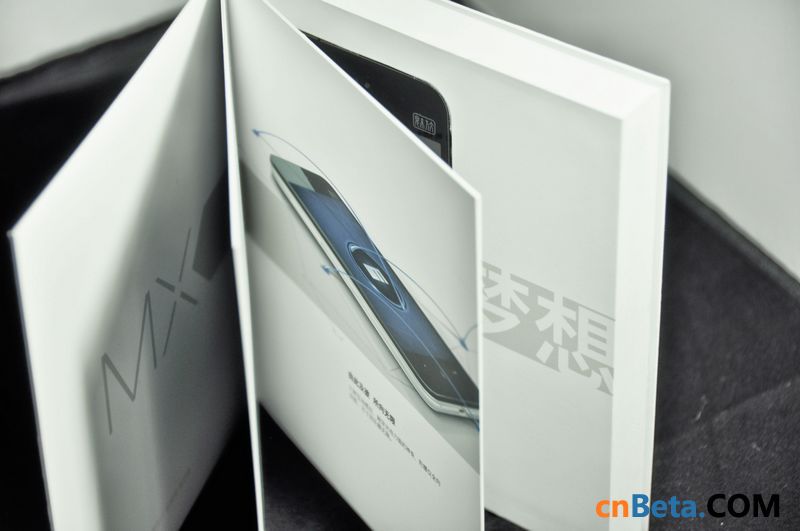MX的充电器黑色小巧,输出电压是5V,这就表示新旧两代的充电器是可以通用的。接下来打开看一下机身,“书”前两页是介绍MX的特点,第三页,MX的机身是嵌入在“书”里的,最后一页放置的是数据线和SIM卡套。