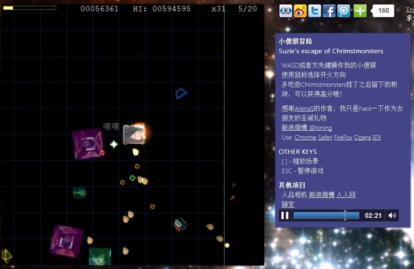 近日圣诞节异地的女朋友吵着要圣诞礼物,于是花一通宵hack了一款html5的游戏,加入声音等,由于她在国外,索性加入了两种语言。说起送礼物,这也许是我一贯的思维方式吧,code其实是一件很轻松的事情,特别是乐在其中的时候,异地恋伤不起,我是来cnBeta求BLESS的。