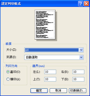 可以配置頁面大小和紙張來源、方向、頁邊距,因為這些選項都依賴於打印機,所以在這個對話框中也可以選擇打印機。