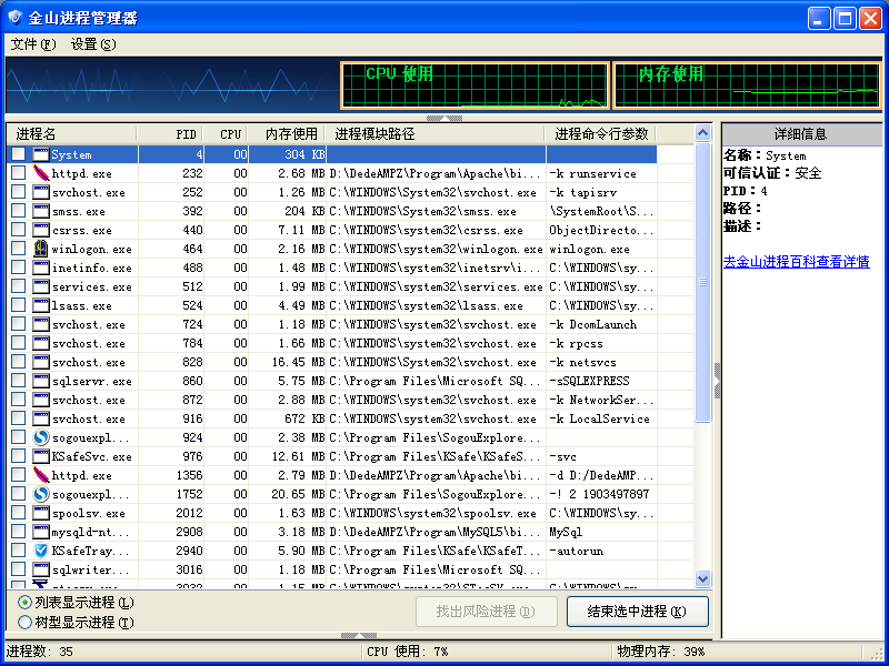 直接双击即可使用,功能比Windows自带的任务管理器强大,可以查看进程的路径和参数,能有效识别木马进程。
